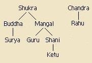 Shukra, Chandra, Budha - Ahimsa, Vereinheitlichung und Satyagraha als Gandhis Erfolgsprinzipien Die folgende kleine Grafik veranschaulicht die "Herrschaftsstruktur" der neun Planeten im Chart von Gandhi: